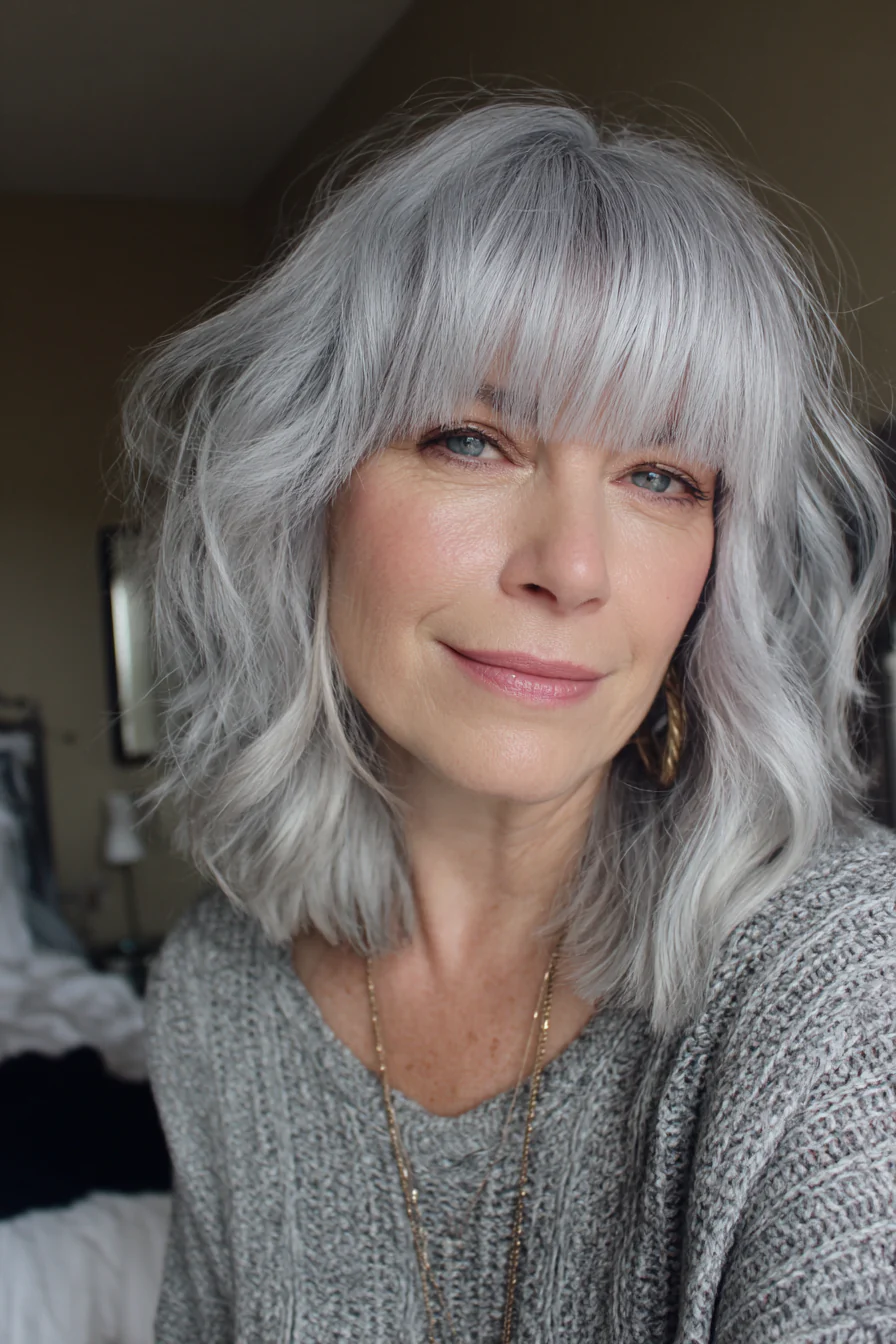 12. Серебристая многослойная стрижка средней длины с челкой-шторкой