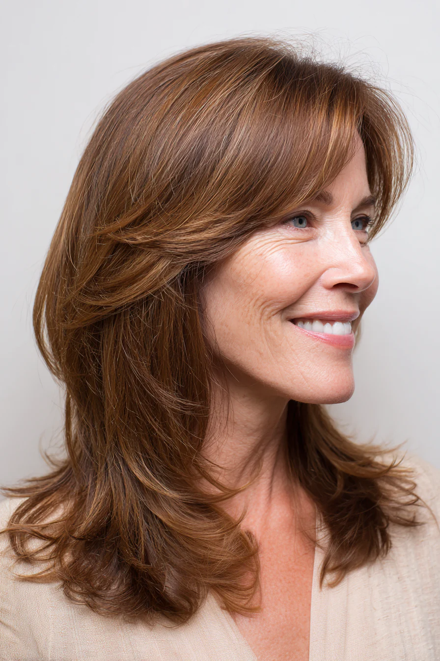 Это удачный вариант для тех, кто хочет сохранить длину, но убрать плоскость. Длинные слои добавляют мягкое движение, а каштановый оттенок помогает волосам выглядеть плотнее.