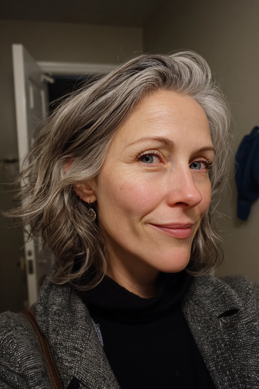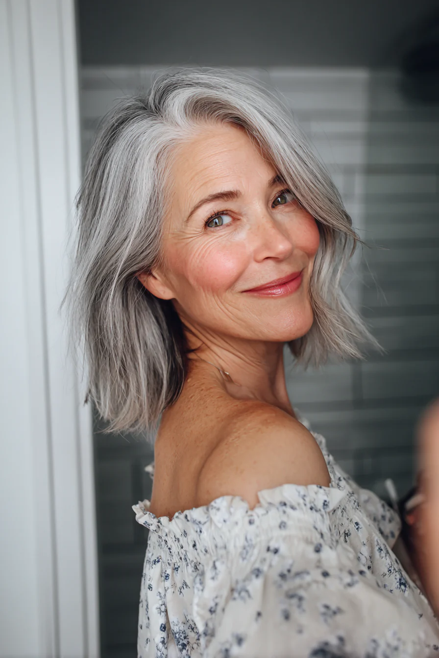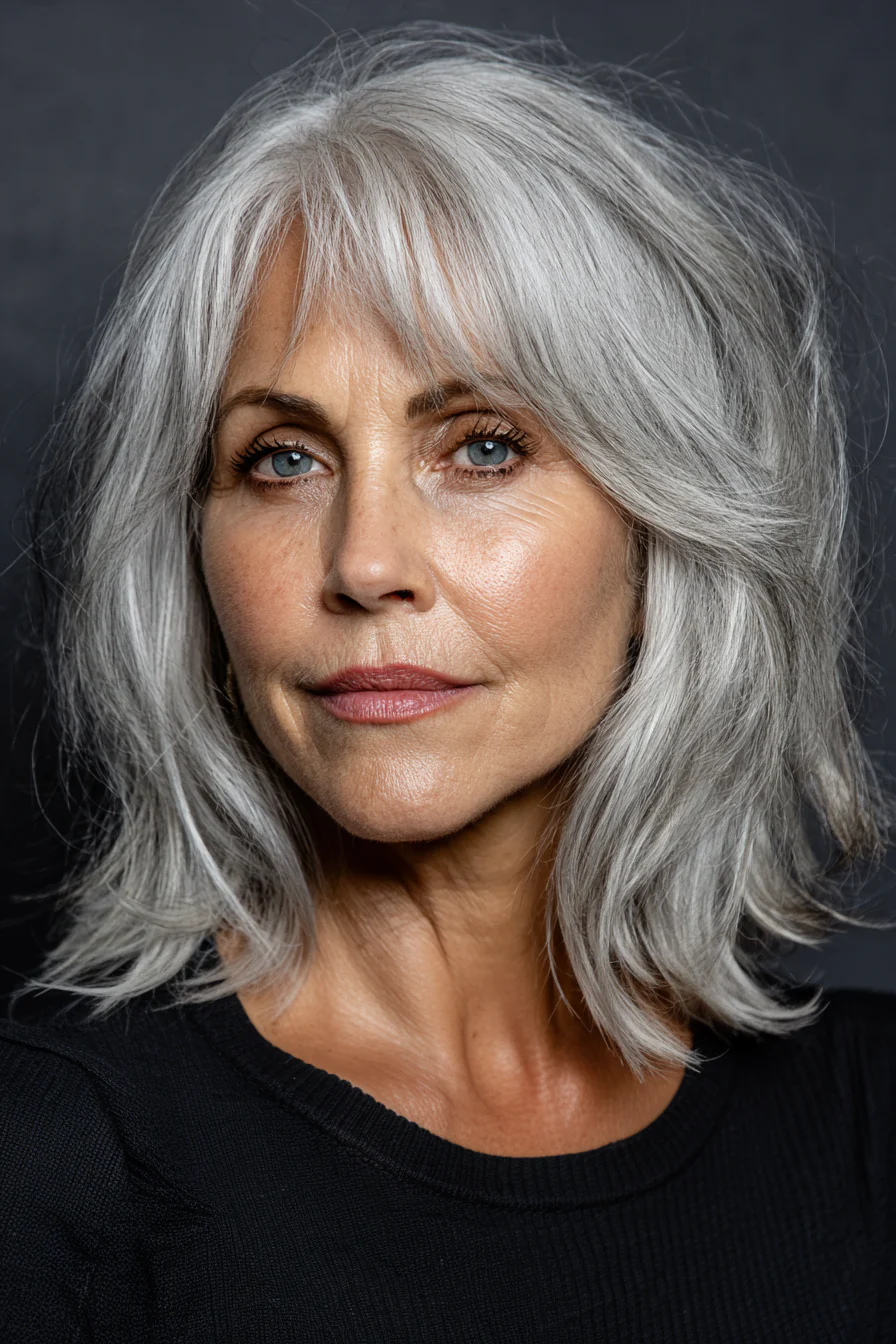 Слои и боковой пробор вместе отлично работают на объём у корней. Серебристый оттенок здесь выглядит особенно современно, без ощущения тяжести или усталости.
