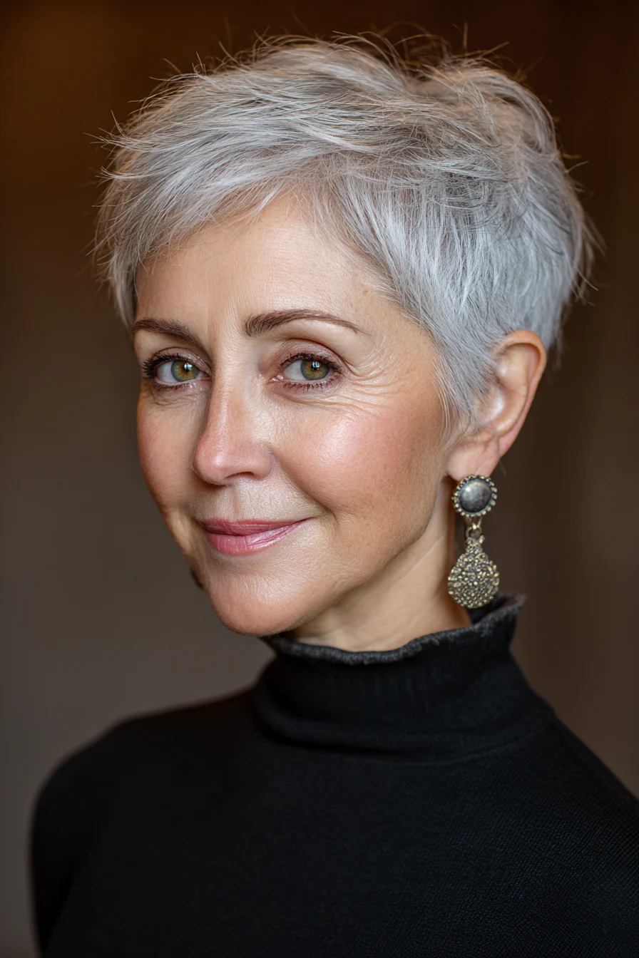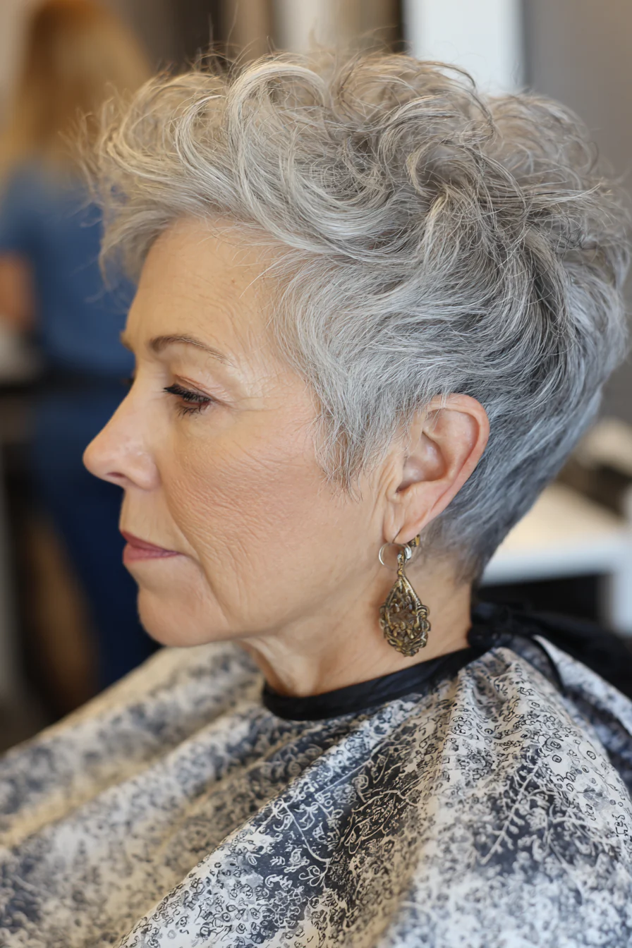 6. Короткая стрижка с естественным переходом седины и подъёмом у корней