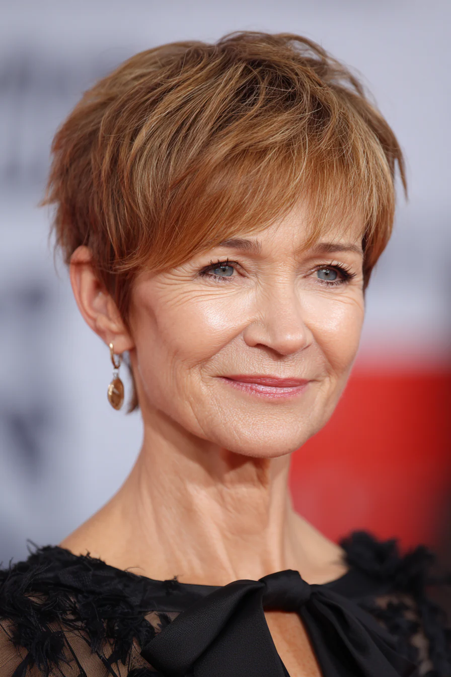 Удлинённая челка делает пикси более пластичной и женственной. Карамельный оттенок добавляет образу мягкости, а короткая длина помогает удерживать объём.