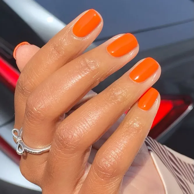 Если хочется цвета, но без ощущения перебора, мандариновый, один из самых удачных вариантов. На коротких ногтях этот цитрусовый тон смотрится не слишком громко, а очень стильно, как яркий аксессуар, который сразу оживляет весь образ. Особенно хорош летом, но и в любой серый день работает безотказно.