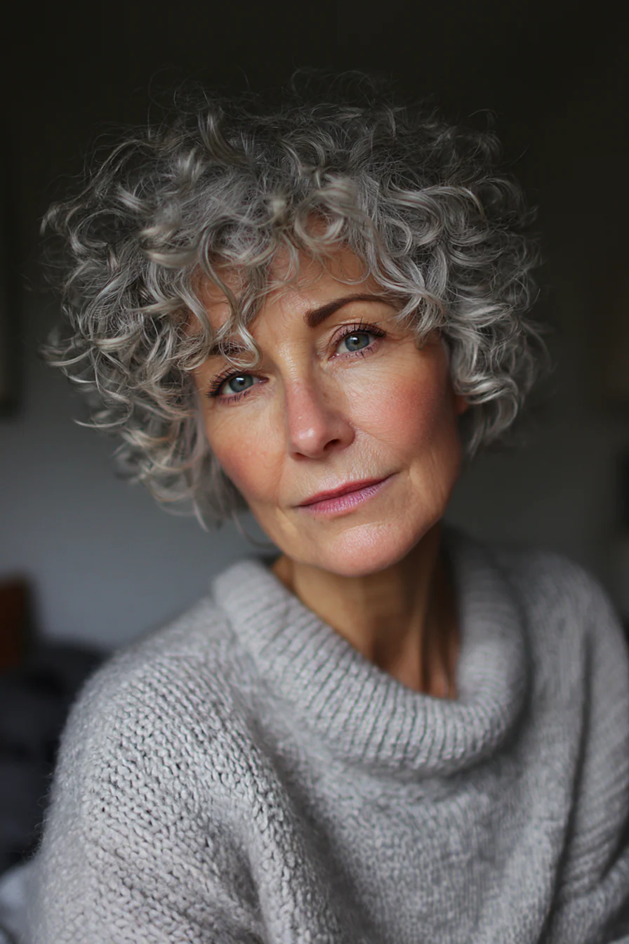 Короткая стрижка, рассчитанная на естественный завиток, всегда выигрывает от правильной формы. Серый оттенок подчеркивает текстуру кудрей, а сама длина помогает сохранить упругость и подвижность.