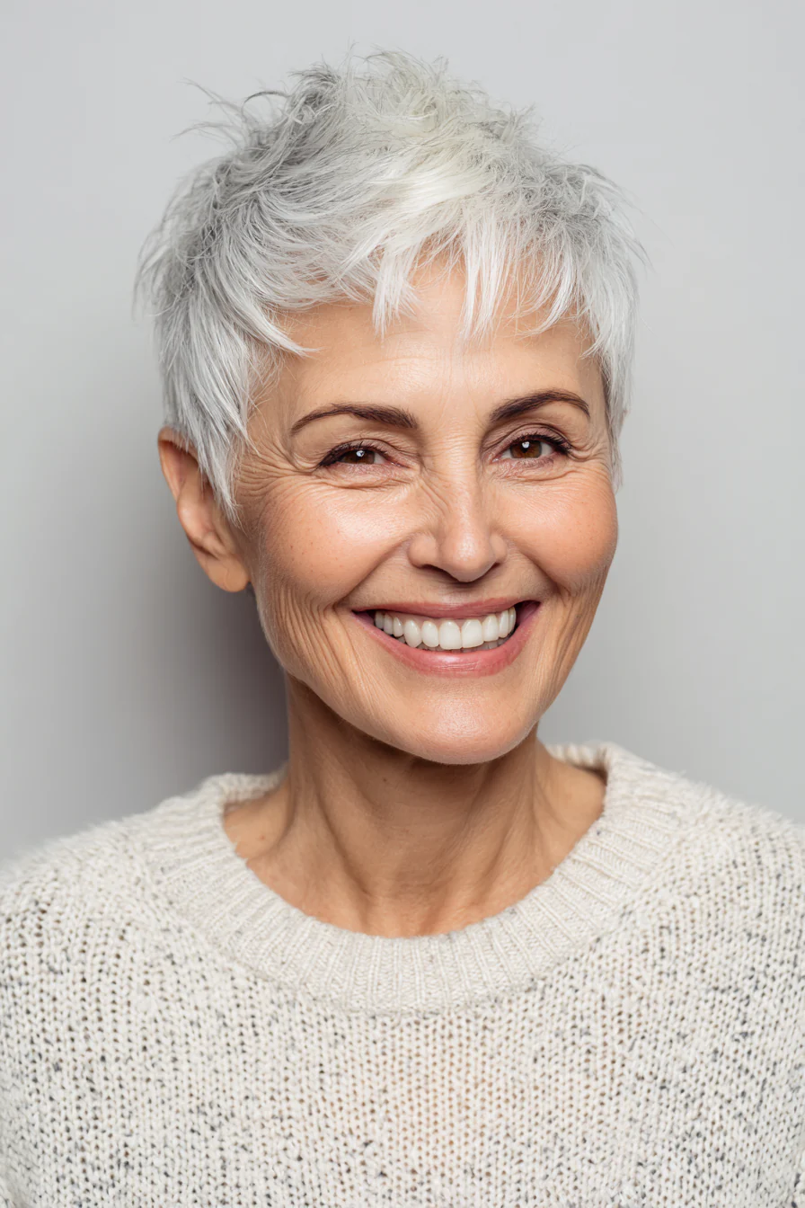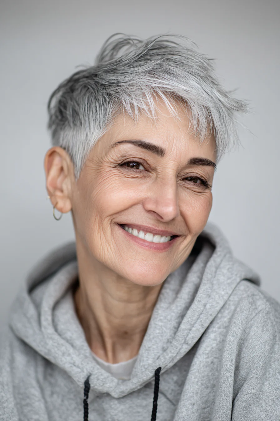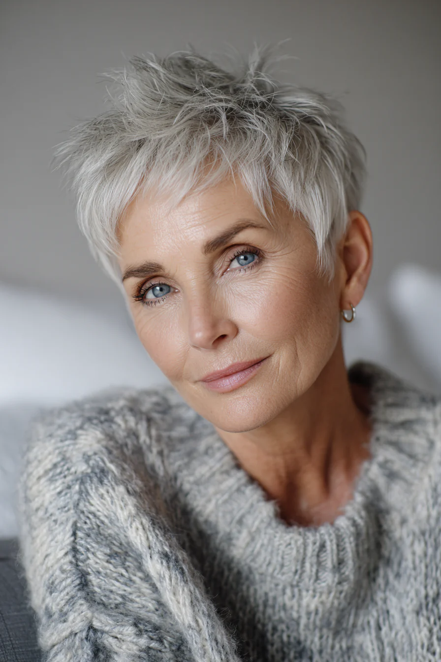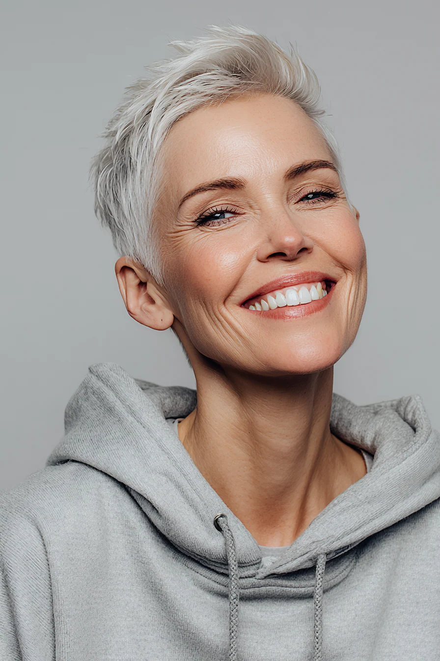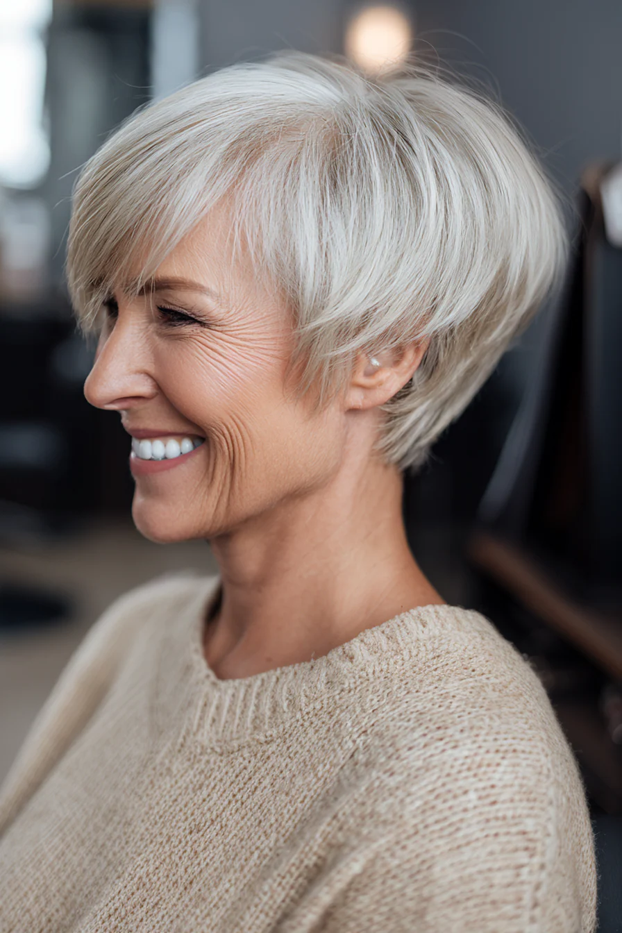 Пикси с деликатным андеркатом может смотреться современно, но без лишней резкости. Мягкий серый оттенок делает образ благороднее, а сама стрижка сочетает четкость формы и легкость.