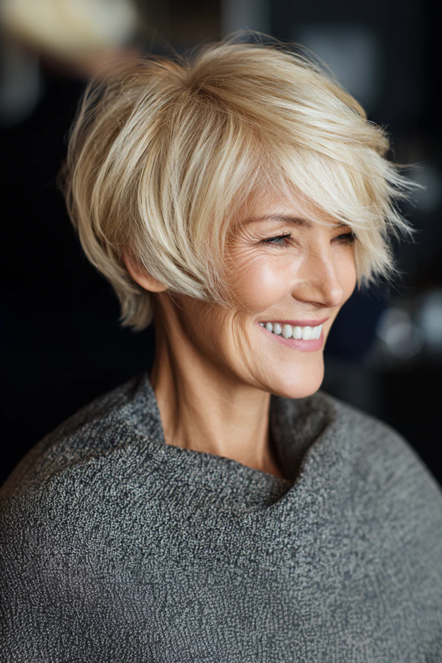 Бикси, гибрид боба и пикси, хорош тем, что сочетает легкость короткой стрижки и более мягкий силуэт. В мягком блонде и с плавно растушеванными слоями он выглядит современно и очень живо.