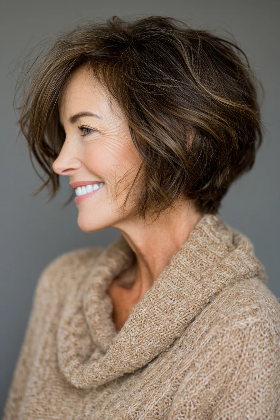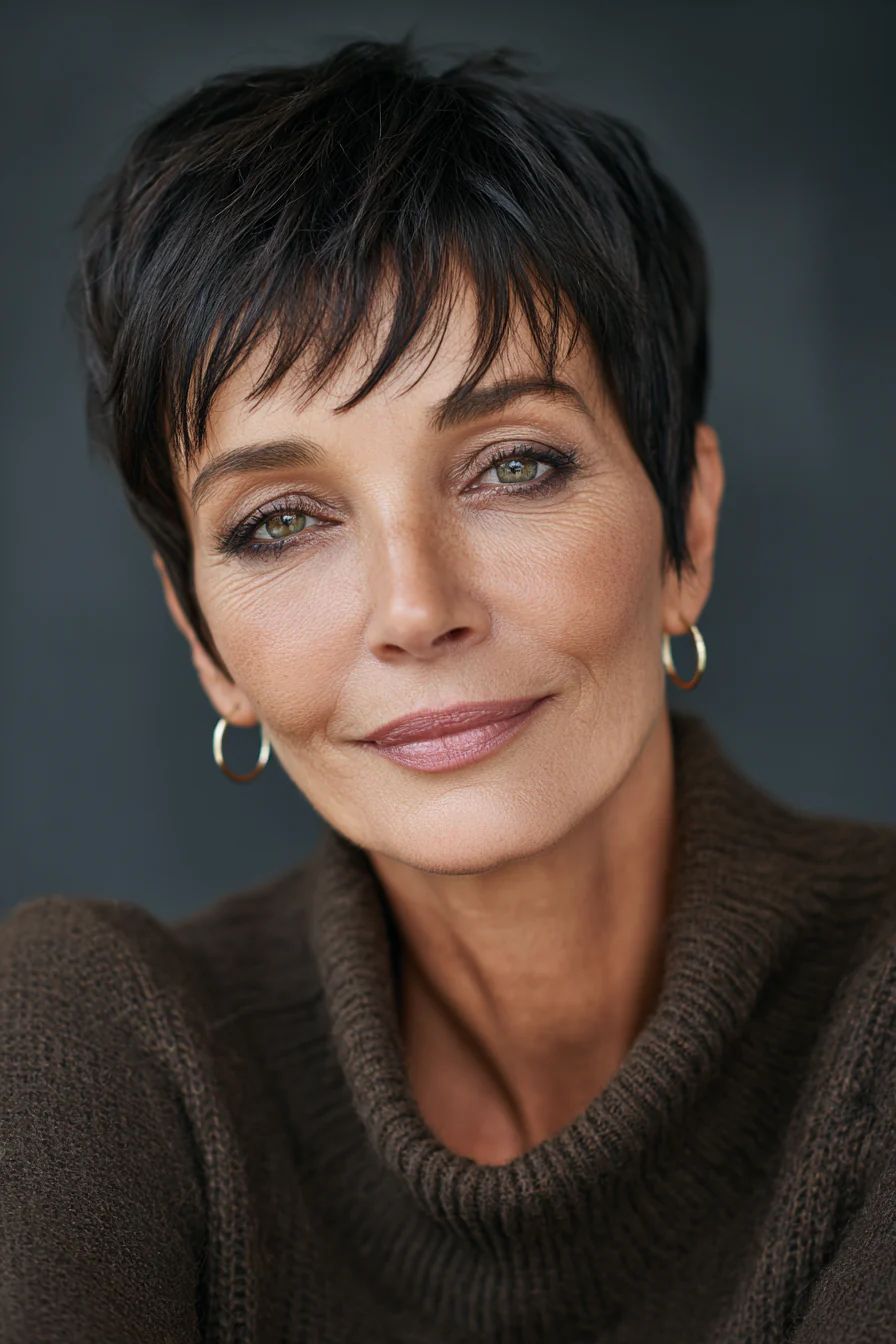 Короткая текстурная стрижка с мягкой челкой хорошо собирает форму и делает волосы визуально плотнее. Глубокий брюнетистый оттенок добавляет глубины, а слои дают нужную подвижность.