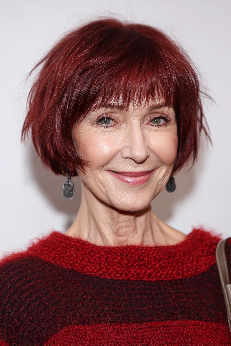 Короткий боб с текстурой в оттенке бордо сразу делает образ выразительнее. Цвет добавляет глубины и характера, а классическая форма не дает стрижке уйти в слишком резкое настроение.