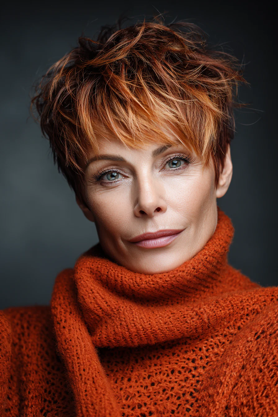 Медный оттенок сразу добавляет образу тепла и света. За счет слоев короткая пикси выглядит текстурной, держит объем и не кажется слишком строгой.