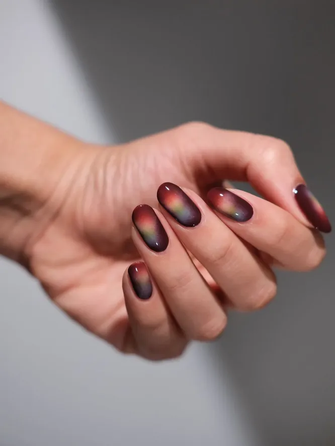 Еще один плюс: тренд хорошо работает и на коротких, и на длинных ногтях. На коротких он выглядит плотнее и современнее, особенно если выбрать темный глянец или «кошачий глаз». На длинных можно добавить больше деталей: капли, красные линии, серебряные элементы, аура-эффект, микроблестки.