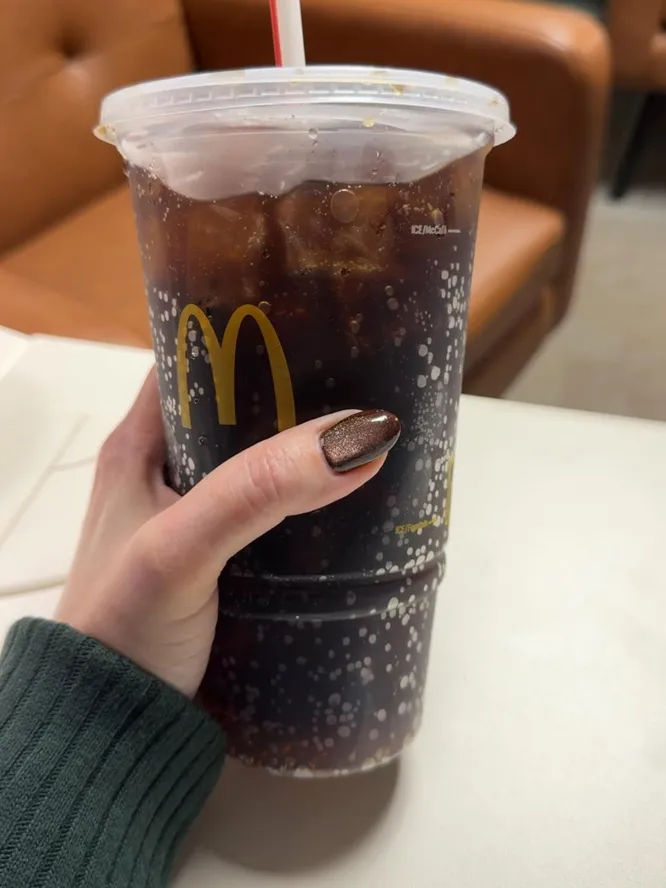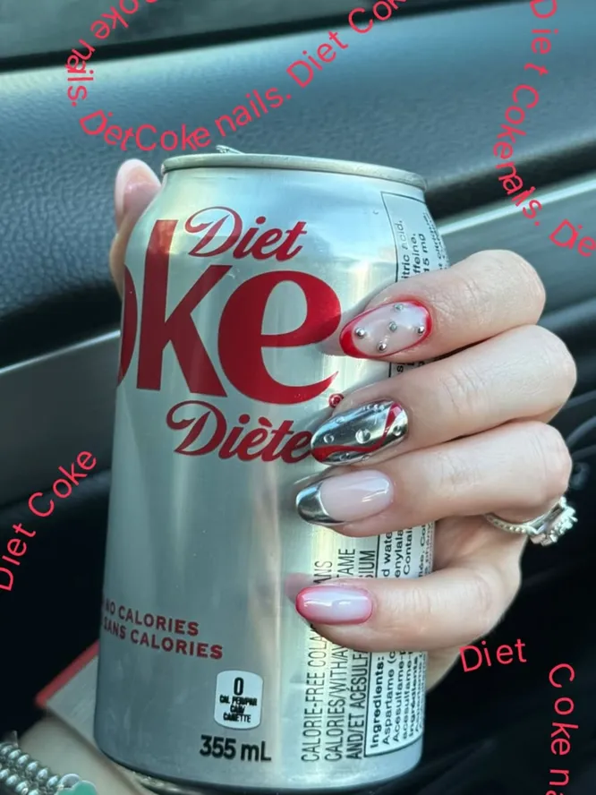 Название звучит почти как шутка, но тренд выглядит неожиданно дорого. Вдохновение очевидное: холодная кола со льдом, серебристая банка, красные акценты, карамельный блеск, пузырьки, глянец и тот самый эффект напитка, который открыли в жаркий день. Маникюр получается сочным, немного ностальгическим и очень фотогеничным.