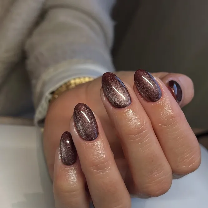 Лаки с эффектом «кошачьего глаза» идеально попадают в эту тему. Магнитный блик напоминает свет, который проходит через темный напиток. В коричневой, кофейной или почти черной гамме такой маникюр выглядит не игрушечно, а очень собранно.