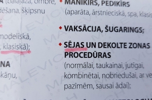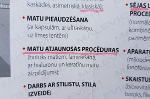 Текст прейскуранта одного из салонов красоты смутил многих клиентов. Житель Межциемса Айгар заметил грамматические ошибки как на витрине заведения, так и на рекламном буклете. На брошюре мужчина нашел более 10 ошибок и указал на это сотрудникам компании, однако по его словам, никаких действий по исправлению ошибок на печатной продукции от заведения не последовало, пишет Skaties.lv.