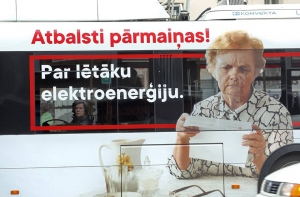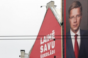 Помимо фотографий политиков на плакатах размещены лозунги о развивающейся и благополучной Латвии, которые, впрочем, не всегда совпадают с реальностью.