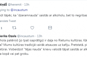 «Потребитель алкоголя (особенно разумный) - часть западной культуры. Почему чай, а не кофе? В нашей культурной традиции больше ссылаются на кофе. В отличие от, например, русской литературы. В конце концов, «чаевые» на русском языке также связаны с алкоголем. Часто выпивали вместе», - пишет Озолс.