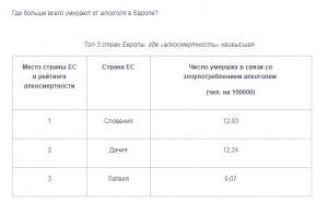 Если говорить о смертности из-за злоупотребления алкоголем, то лидирующей по этому критерию стала Словения (12,83 умерших человека на 100 тысяч человек), за ней следует Дания (12,24 человека) и Латвия (9,07).