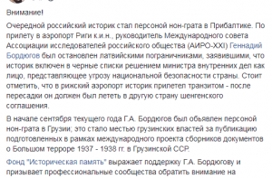 Латвийские власти включили в так называемые «черные списки» главу Международного совета Ассоциации исследователей российского общества (АИРО-XXI) Геннадия Бордюгова. Об этом его известили латвийские пограничники в аэропорту Рига, куда он прилетел транзитным рейсом с целью после пересадки отправиться в другую страну шенгенского соглашения. Об этом сообщают в соцсети Facebook представители российского Фонда «Историческая память», в том числе историк и бывший третий секретарь Посольства РФ в Латвии Владимир Симиндей ранее внесенный в черный список Латвии.