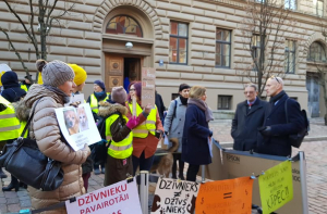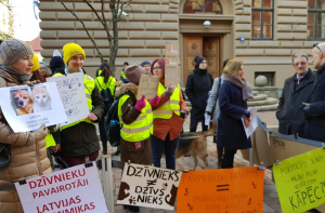 У здания Сейма в пикете, посвященном правам домашних животных в Латвии, приняли участие около 40 человек, многие из которых были одеты в желтые жилеты с надписью dzīvniekupolicija.lv.