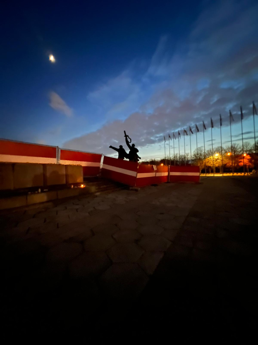 Сегодня днем на заборах, которыми огражден монумент в целях безопасности, растянули украинский и латвийский флаги.