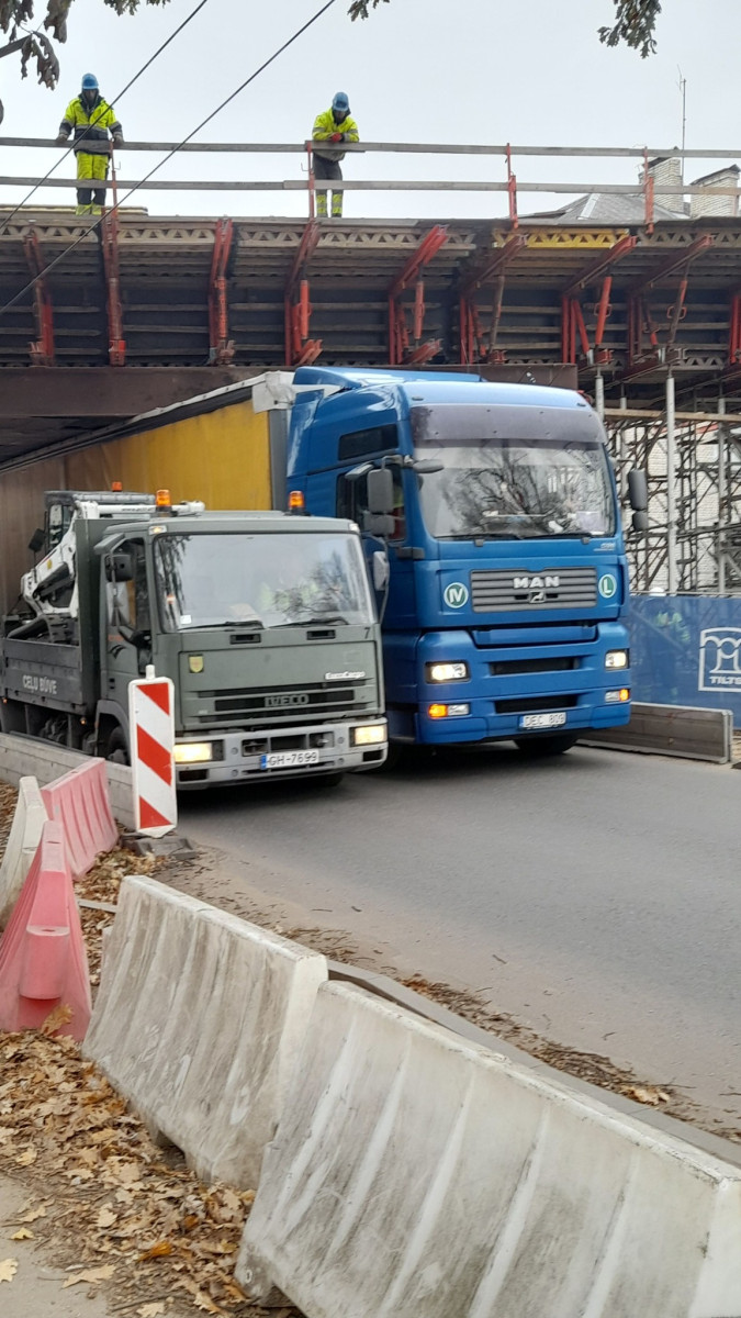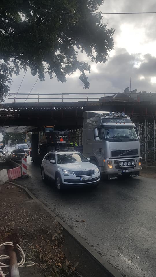С момента начала строительства путепровода в рижском районе Пурциемс на улице Иерикю под ним застревало уже несколько фур. Во вторник вечером жители района вновь поделились фотографиями застрявшего под путепроводом грузовика.