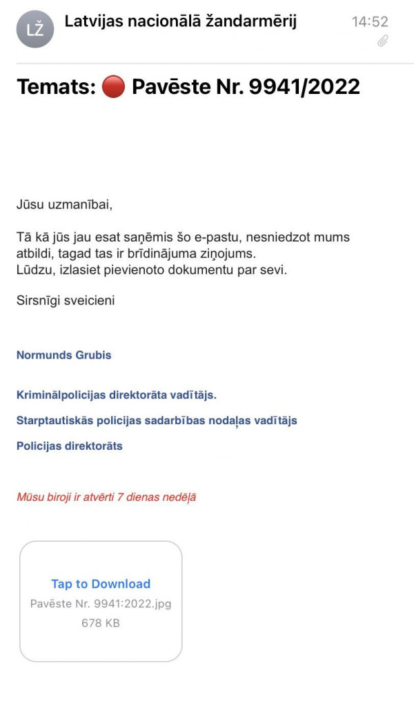 Отправитель электронного письма указан как «Национальная жандармерия Латвии». К электронному письму прикреплено сообщение, которое вы можете открыть после загрузки на свое устройство.
