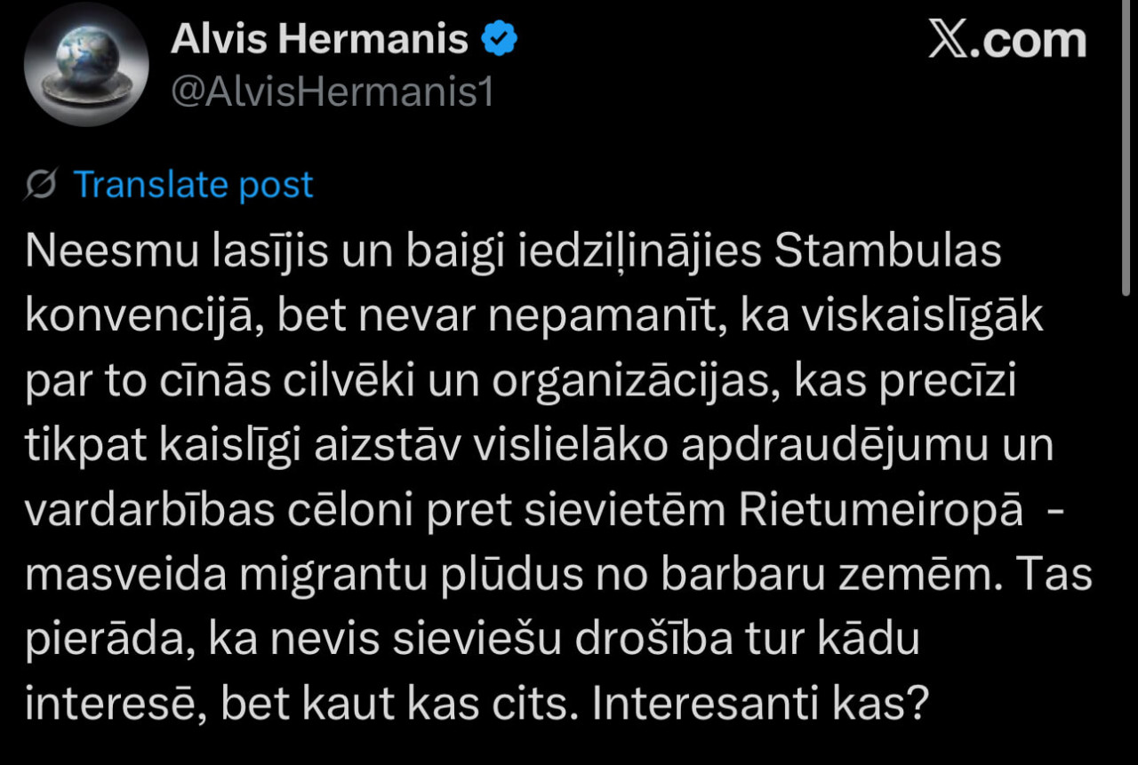 Херманис не стесняется в выражениях и прямо бросает вызов: «Я не читал Стамбульскую конвенцию и не вникал в неё глубоко, но не могу не заметить, что люди и организации, которые яростнее всего за неё борются, - это те же люди и организации, которые столь же яростно защищают самую большую угрозу и причину насилия в отношении женщин в Западной Европе - массовый приток мигрантов из варварских стран. Это доказывает, что всех там интересует не безопасность женщин, а что-то другое. Интересно, что?»