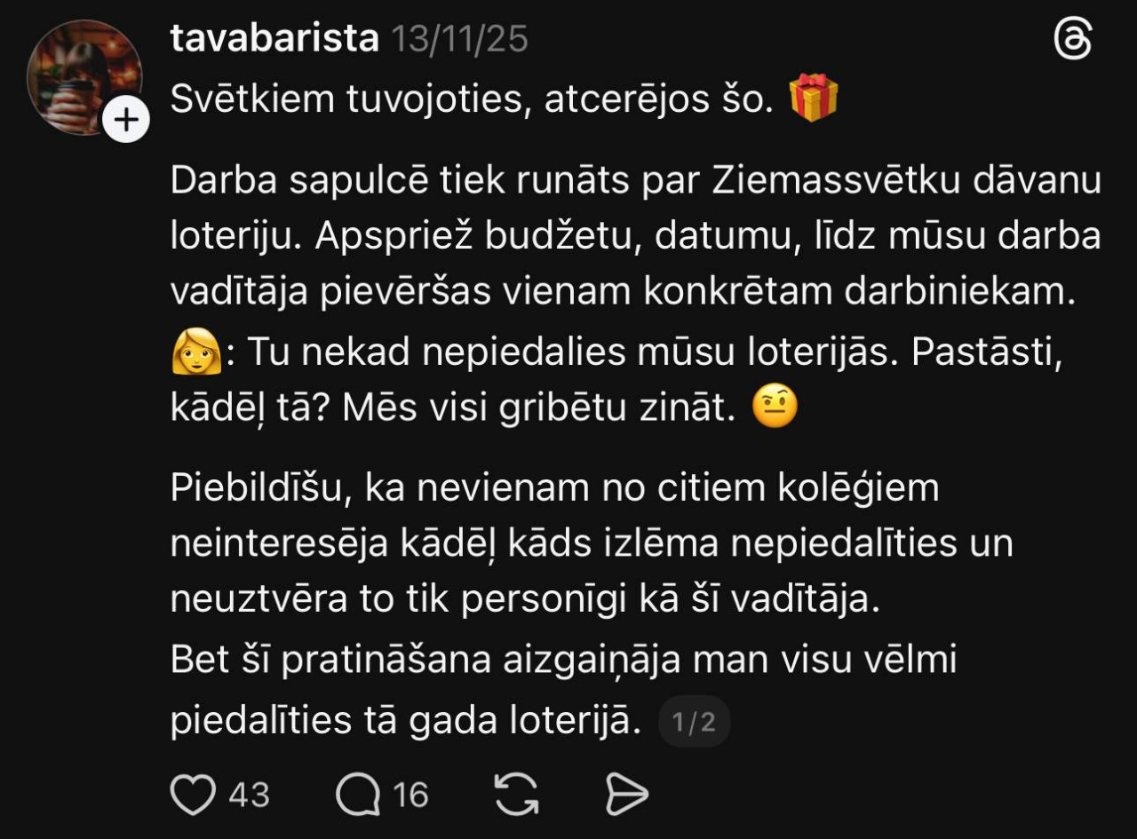 Чем ближе Рождество, тем чаще в офисах начинают обсуждать привычные праздничные ритуалы - от новогоднего стола до традиционных «тайных Санта»-лотерей. Для одних это тёплая игра и возможность подарить коллегам приятные мелочи. Для других - источник лишнего стресса, неловкости и не всегда оправданных расходов, пишет la.lv.