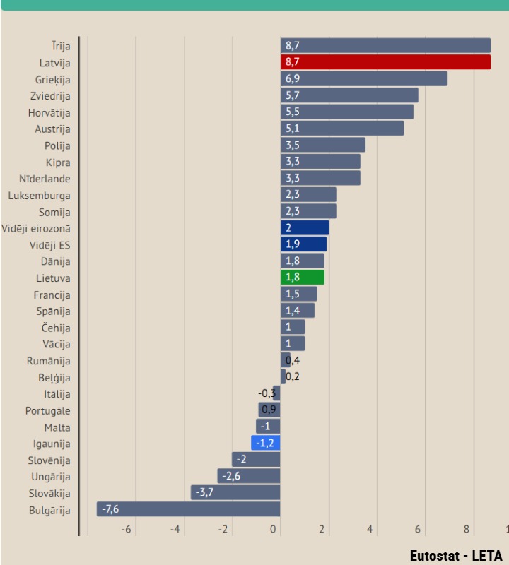 Среди восьми стран, где в октябре по сравнению с аналогичным периодом прошлого года был отмечен спад, наибольшее сокращение зафиксировано в Болгарии (–7,6%), Словакии (–3,7%) и Венгрии (–2,6%). В Эстонии объём промышленного производства снизился на 1,2%, тогда как в Литве он, напротив, вырос на 1,8%.