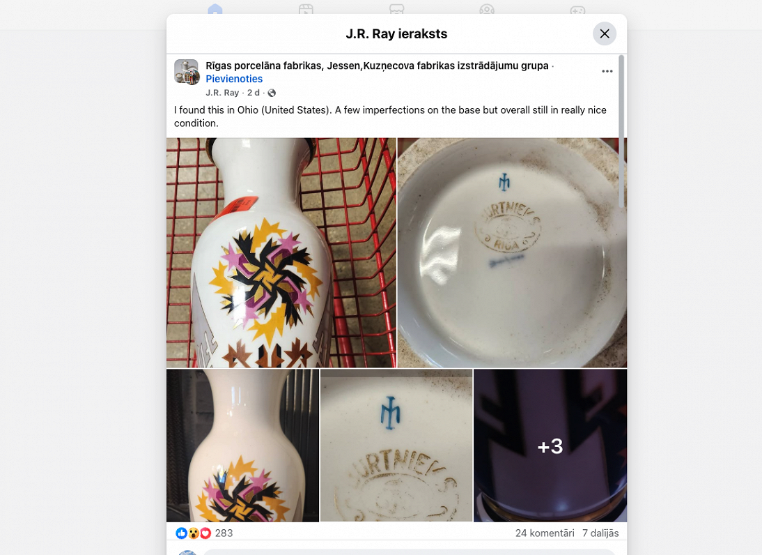 Рей, опытный собиратель, не смутился дефектом и купил вазу всего за 3,75 доллара. На дне сохранилось клеймо мастерской Burtnieks, работавшей в Риге с 1929 по 1939 год. Поиск истины привел американца в тематическую группу в Facebook, объединяющую знатоков латвийского фарфора.