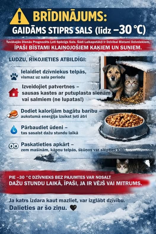 В ближайшие дни на территории Латвии ожидается резкое похолодание. Столбики термометров могут опуститься до -30 °C. Для уличных животных такие условия - это вопрос жизни и смерти. Зоозащитники просят жителей не оставаться в стороне и помочь четвероногим пережить пик холодов.