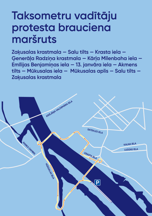 Маршрут автоколонны пройдёт по ключевым транспортным артериям города: набережная Закюсалы - Островной мост - улица Краста - набережная генерала Радзиня - улица Карла Миленбаха - улица Эмилии Беньямин - улица 13 Января - набережная 11 Ноября - Каменный мост - улица Мукуcалас - круговое движение на Мукуcалас - далее снова Островной мост и возвращение на Закюсалу.