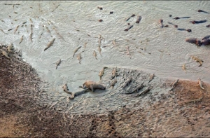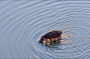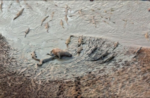 Один бегемот лежал мертвый в окружении грозных рептилий, остальное стадо стояло в воде и планировало дальнейшие действия. Бегемоты выбрали отступление.