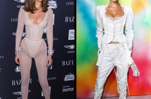 Белла уверенно себя чувствует на публике, но всему есть свой предел: бежевый комбинезон с глубоким вырезом вызывает ощущение, что стилисты не успели надеть на девушку юбку, а второй вариант похож на смешение самых модных трендов 2000-х и смирительной рубашки.