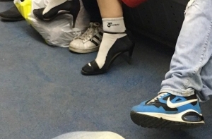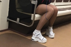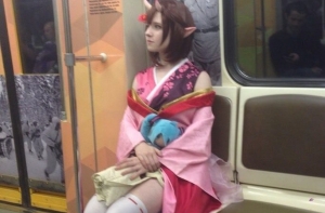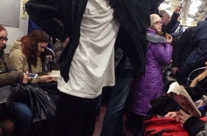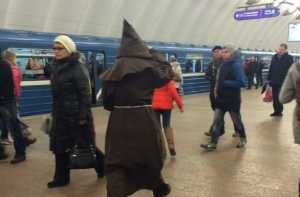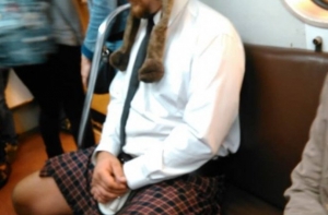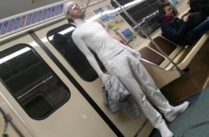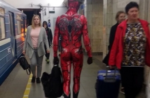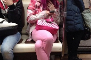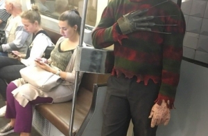 Очередная фото-подборка странных пассажиров метро, кого только в подземке не встретишь, здесь и мужчины в юбках, розово-волосые эльфы, человек паук, и даже американский коп с фредди крюгером.
