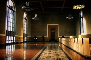 В работе над проектом этого здания отец и сын, Джон и Дональд Паркинсоны, использовали смешение испанского колониального стиля и современного на тот момент стиля ар-деко. Высокий белый колониальный потолок вокзала напоминает старую Калифорнию, в то время как его главный зал ожидания роскошно декорирован окрашенной древесиной по стенам и разноцветными мраморными вставками на полу.