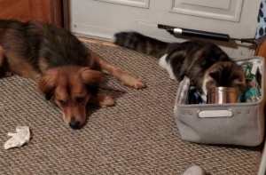 8. «Кот научился открывать банку с лакомствами. Хорошо хоть пес понимает, что они ведут себя плохо»