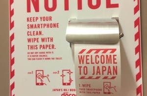 «Внимание! Сохраните ваш смартфон чистым. Протрите его этой бумагой. Не вытирайте руки этой бумагой. Она растворяется в воде. Смойте ее в унитаз. Добро пожаловать в Японию!»