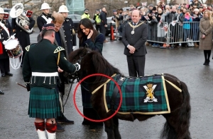 Еще один легкий казус произошел во время визиты высокопоставленной четы в Шотландию. Там фотографы засняли Меган так, что ее пальто слилось по цвету с попоной встретившегося красавице пони. Этот случай, впрочем, показался большинству скорее забавным, чем проблемным.