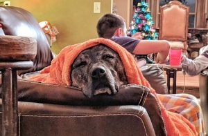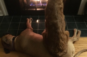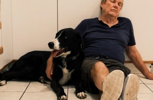 «Наша собака была напугана фейерверками в канун Нового года и отказалась уходить из кухни. Нашел моего папу сидящим вот так на полу»