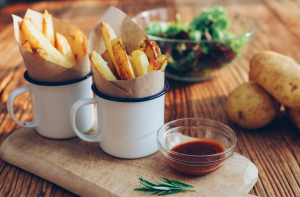 Обед: жареный картофель с курицей, фасолью и морковью; йогурт с ягодами и кленовым сиропом.