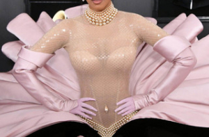 Затмила же всех Карди Би в винтажном платье из кутюрной коллекции 1995 года Mugler Сouture. Баска в форме раковины, прозрачный топ и украшения из жемчуга явно пришлись по душе Карди. Однако у критиков моды вызвали большие сомнения в плане выбора певицы.