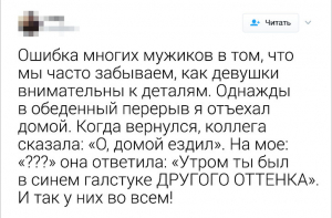 Из-за разницы между женским и мужским восприятием мира периодически возникают ситуации, которые вызывают неподдельное удивление у представителей противоположного пола. Наблюдение за женами, девушками, коллегами и просто случайными незнакомками дарит им немало занимательных открытий.