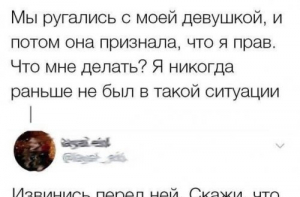 Поздравляем всех девушек и женщин с 8 марта! Будьте здоровы и счастливы!И предлагаем вашему вниманию свежую подборку фото-приколов, мемов, картинок на праздничную (и не только) тему.Сегодня в выпуске: что делать, если девушка оказалась не права и признала это; единственный способ жить хорошо; оригинальные поздравления с международным женским днем; что подарить женщине; почему крокодил Гена играл на гармошке; и многие другие веселости и приколычи.Предыдущая подборка здесь.