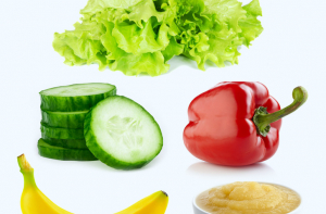 1 стакан яблочного пюре, 1 большой банан, 1 красный перец, полстакана ломтиков огурца и 2 стакана зеленого салата. Стакан клубники, апельсин, 1 стакан помидоров черри, стебель сельдерея и 1 стакан тушеной капусты. 1 нектарин, полстакана сушеной вишни, стакан кусочков огурца, полстакана моркови и 1 стакан тушеной капусты. 1 стакан ломтиков дыни и 1 яблоко, стакан салата из капусты, сладкий перец и стебель сельдерея.