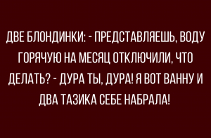 Идут блондинка и брюнетка по джунглям. Вдруг из кустов выскакивает тигр. Брюнетка, недолго думая, кидает горсть песка в глаза тигру и лезет на дерево. С дерева говорит блондинке: