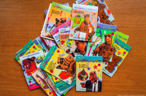 Все помнят Альфа, с планеты Мельмак. В 90-х выпускали карточки с «сумасбродными советами», иногда кстати с довольно интересными. Не могу вспомнить, как они продавались. Жевачка отдельно, карточка отдельно? Совсем вылетело из головы…