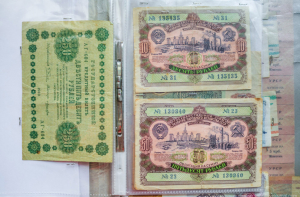 24. В другой папочке бережно хранятся бумажные деньги. Здесь совсем немного интересных предметов, пара облигаций на солидную для тех времен сумму.