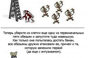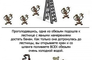 Мы в редакции Интересно знать решили поделиться с читателями результатами одного необычного опыта. Проводили его над обезьянами, но итог вполне можно спроецировать и на наше общество. Итак, в клетку посадили пять обезьян, посреди клетки поставили лестницу, а на лестнице поставили банан…