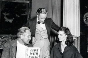 Режиссер Виктор Флеминг держит книгу «Унесенные ветром» и обсуждает съемки с Вивьен Ли и Лесли Говардом (Эшли)