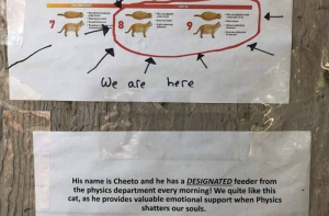 «У Чито есть назначенный факультетом кормящий! Нам очень нравится этот кот, поскольку он обеспечивает ценную эмоциональную поддержку людям, души которых разрушает физика, - объясняют студенты. - У него слишком много лишнего веса, и ради его здоровья, пожалуйста, не кормите его - сколько бы он ни просил! А он будет просить. Потому что знает, что мы лохи!