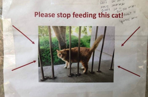 Все знают, как трудно сказать «нет» любимому питомцу, когда он начинает клянчить еду. В одном из калифорнийских колледжей студенты столкнулись с такой проблемой - у них на территории живет толстый рыжий кот. Пришлось нарисовать «научные» плакаты и графики с просьбой не закармливать ненасытное животное!